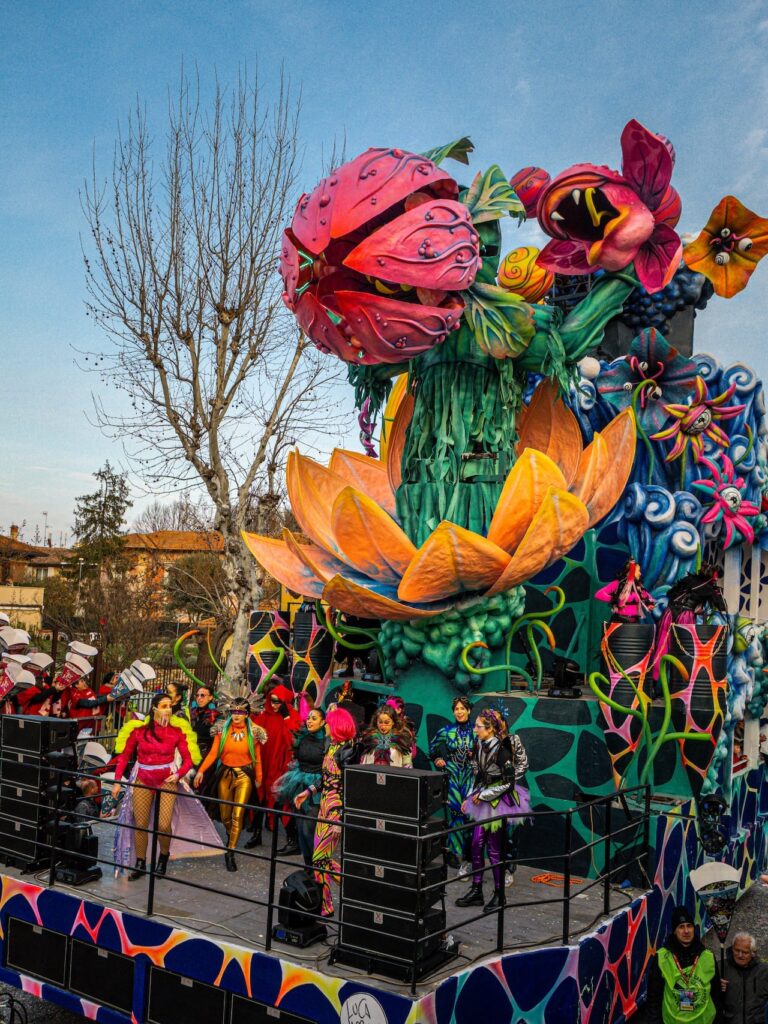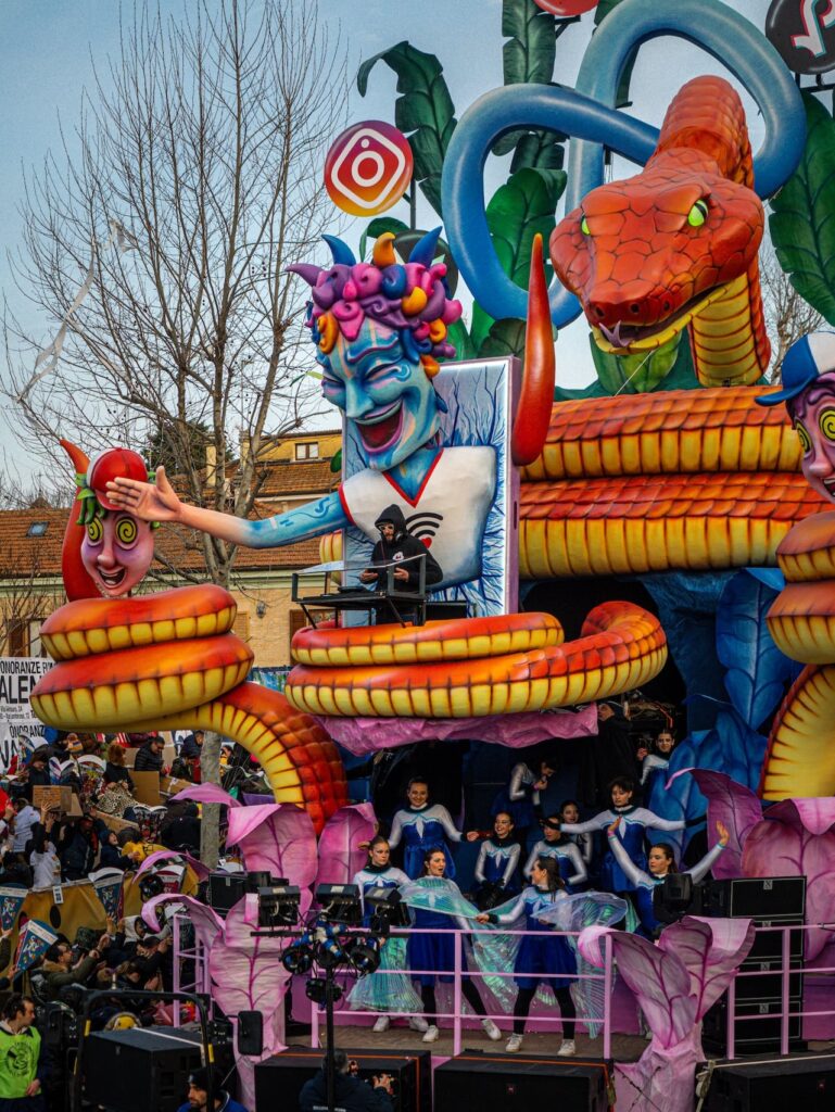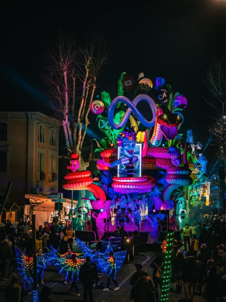 Modellata da maestri carristi locali con talento e passione, la cartapesta dà vita a giganti in movimento, vere e proprie opere d’arte temporanee che sfilano tra musica, luci e applausi.