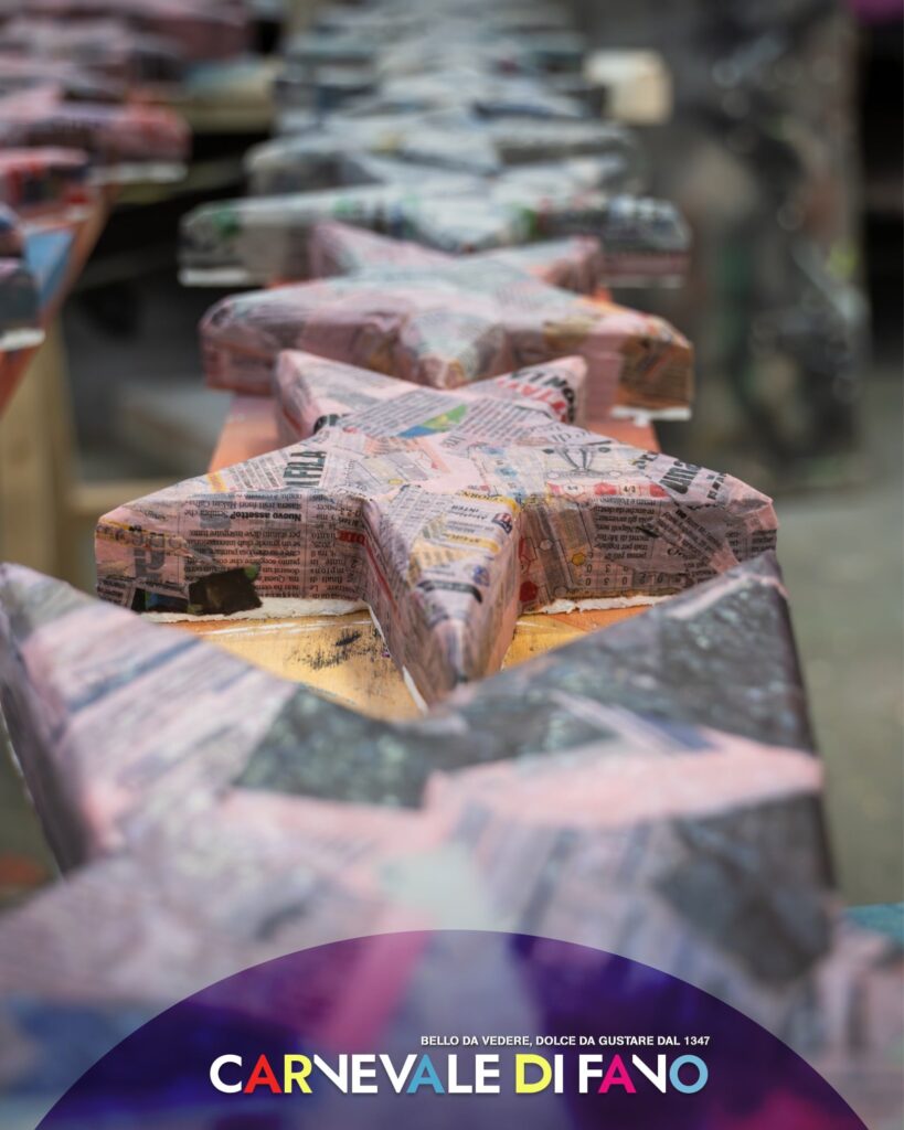 Tutti i carri allegorici del Carnevale di Fano sono realizzati in cartapesta, un materiale povero ma estremamente duttile, composto da carta, colla e acqua.
